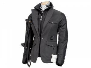 E' fornita di due tasche anteriori a patta con soffietto chiuse da bottoni a pressione, finte tasche con patta e bottone a pressione altezza petto, chiusura anteriore con bottoni metallici, polsini interni elastici, spacchi laterali con zip scomparsa, martingala sul retro con bottoni.