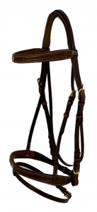 Testiera Tattini in cuoio italiano di alta qualità, con fiocco in strass e bombatura doppia su frontalino e capezzina, cuciture bianche, capezzina inglese con stringibocca, redini con fodera di gomma morbida e nylon interno, fibbie ottone dorato.