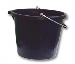 Secchio in plastica con manico in metallo.