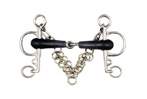 Pelham snodato rivestito in gomma, imboccatura 20 mm, aste 105 mm, con barbozzale e ganci, in acciaio inox.